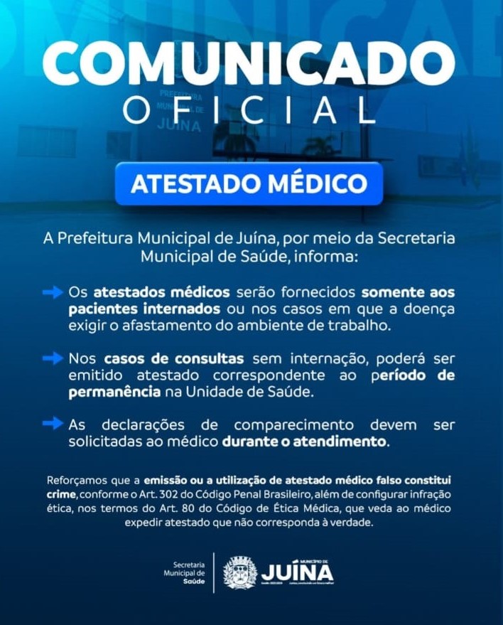 A Prefeitura de Juína, por meio da Secretaria Municipal de Saúde, anunciou uma mudança significativa no procedimento para fornecimento de atestados médicos na rede pública. De acordo com a nova determinação, o documento só será emitido para pacientes que estiverem internados ou cuja condição de saúde exija afastamento do trabalho. Para consultas ambulatoriais comuns, os usuários terão direito a um atestado que cubra apenas o período de sua permanência na unidade, devendo solicitar uma declaração de comparecimento ao médico durante a consulta, se necessário.