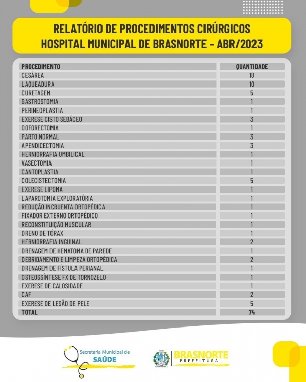 Confira abaixo os relatórios detalhados de todos os procedimentos e cirurgias realizados no Hospital Municipal de Brasnorte: