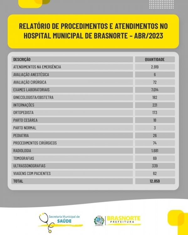 A Secretaria Municipal de Brasnorte divulgou nesta terça-feira, 16, o relatório contendo o total de procedimentos e atendimentos realizados no Hospital Municipal no mês de abril. Os números são surpreendentes – ao todo, 12.859 atendimentos foram feitos na unidade hospitalar.